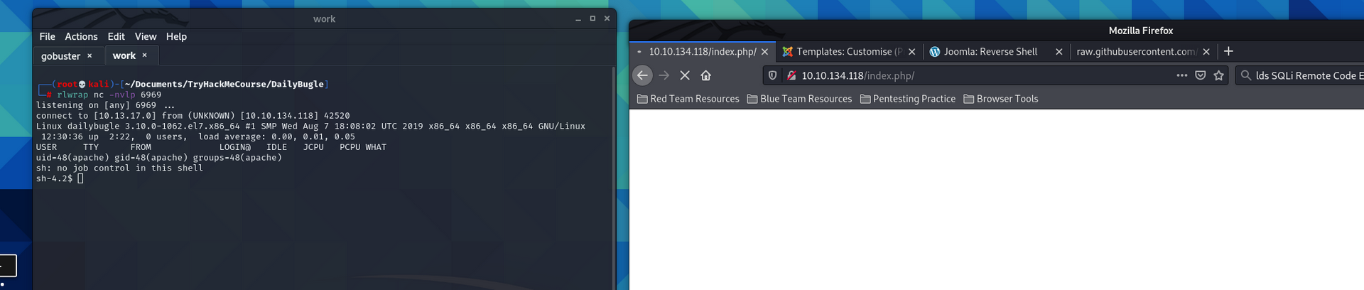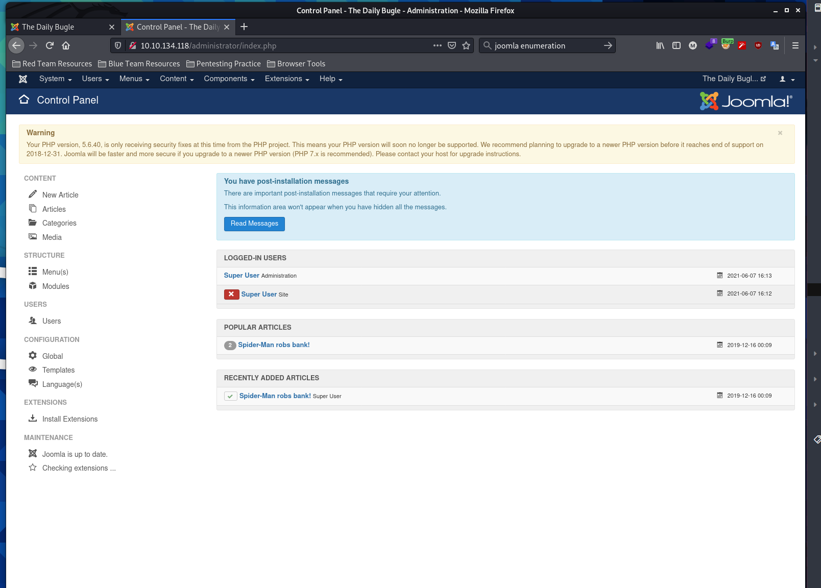 Today I completed the Daily Bugle room as part of the Offensive Pentesting Learning Path on TryHackMe.com I was given an ip address for the box after activating the box. My goal was to find and collect both user and root flags for this box as well as answer a few questions along the way. Using SQLi to exploit an out of date version of the CMS, I am able to gain access to the CMS admin panel and gain an initial foothold in the machine with remote code. Once inside I was able to gain an initial access. I was able to escalate my privileges from web server to user through clear text password in system files, and finally from user to root through misconfigured user permissions.