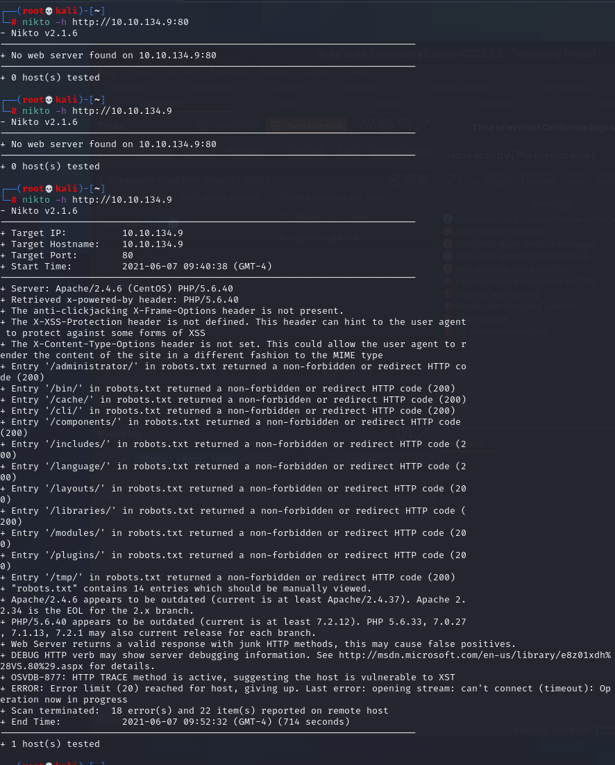 The nikto scan comes completes. It enumerates some directories that are located within the web server as well. The one that catches my eye is the /administrator/. I navigate to it and find a Joomla admin panel. I have no credentials, but may be able to find more upon further enumeration. The nikto scan also returns that the webserver is running a CMS called Joomla. However it does not return the version running.