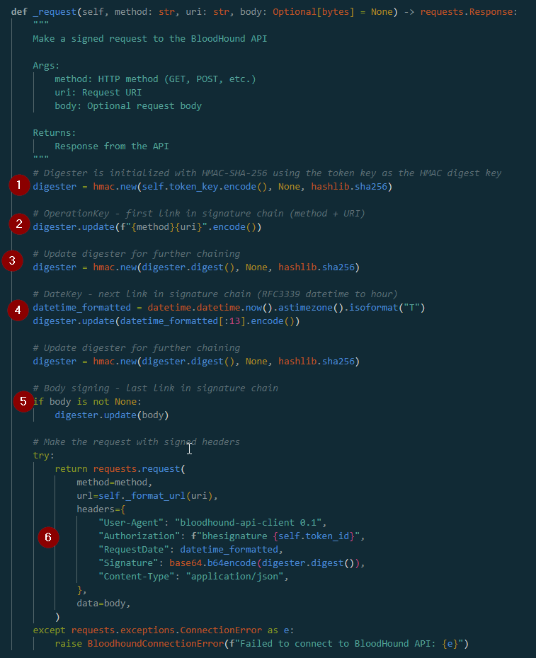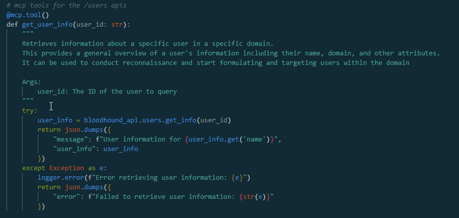 With this implementation, it negated the need to consistently obtain JWTs and users could instead provide the domain of their BloodHound instance, a token ID, and a token key in a “.env” file, therefore lowering the barrier to entry. Additionally, this authentication mechanism laid the groundwork for future plans to provide the MCP with a persistent identity within BloodHound allowing it to evolve from an analyst to a full-on BloodHound admin.