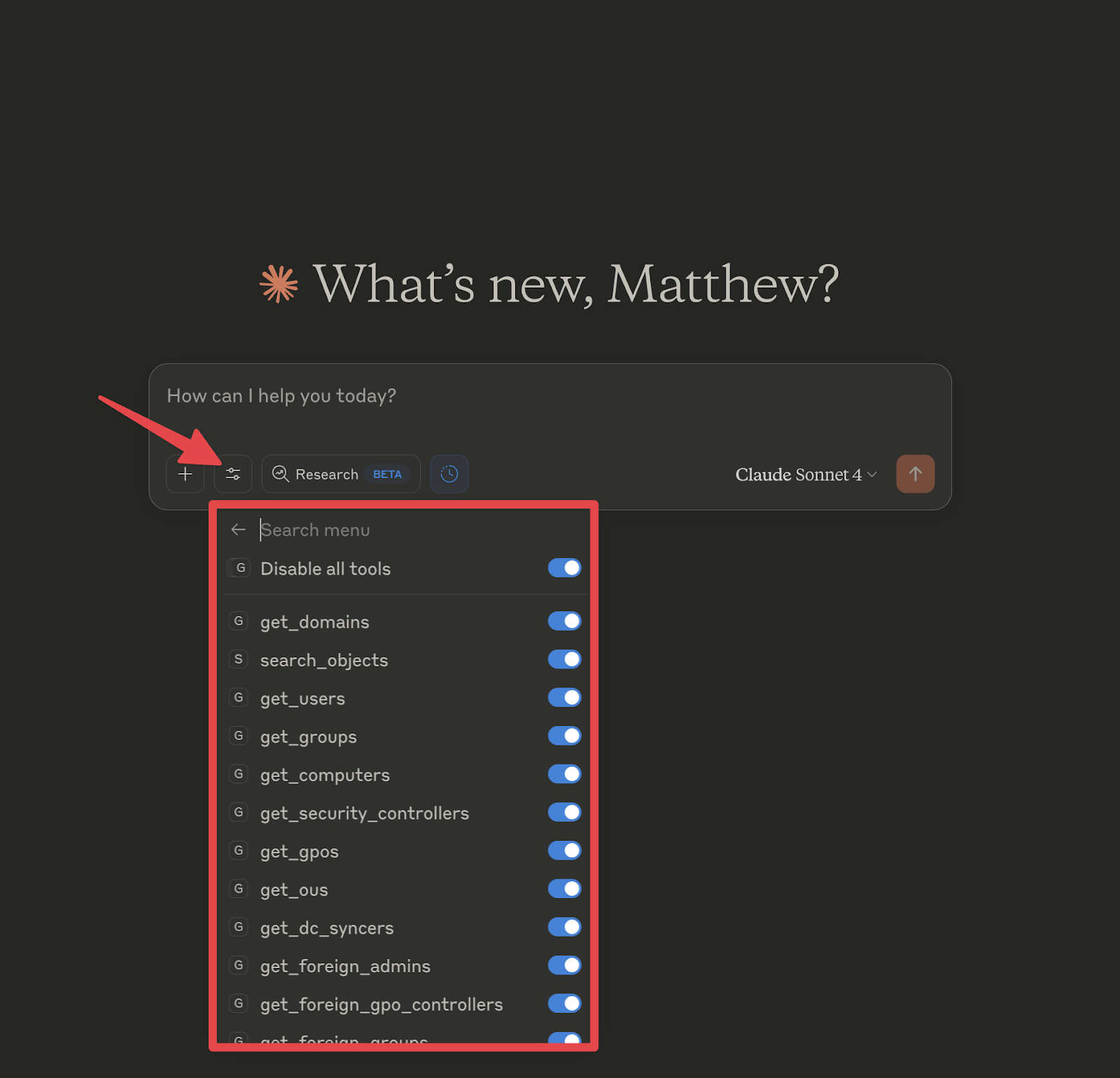 When properly configured and after restarting Claude, a small hammer icon appears in the interface to show that the MCP is connected. This moment was particularly satisfying: seeing that icon meant the MCP server was ready to help analyze BloodHound data.