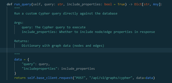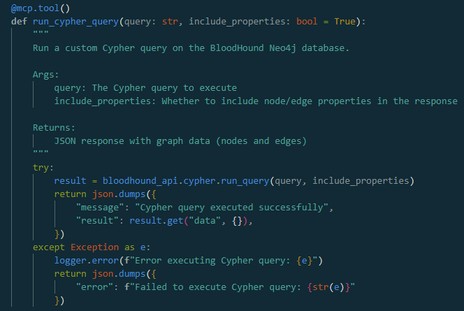 . This client contains methods that allow the LLM to execute cypher queries directly against the Neo4j database that powers BloodHound, giving users the ability to turn complex questions into queries against their data without having an in-depth knowledge of the query language.