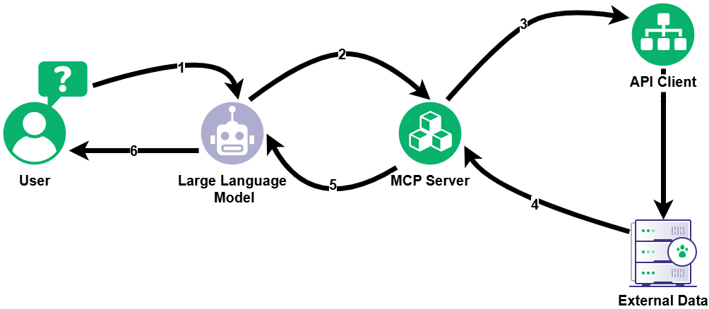 - MCP Server: Acts as an intermediary that translates the natural language of the LLM and the API calls required by external services