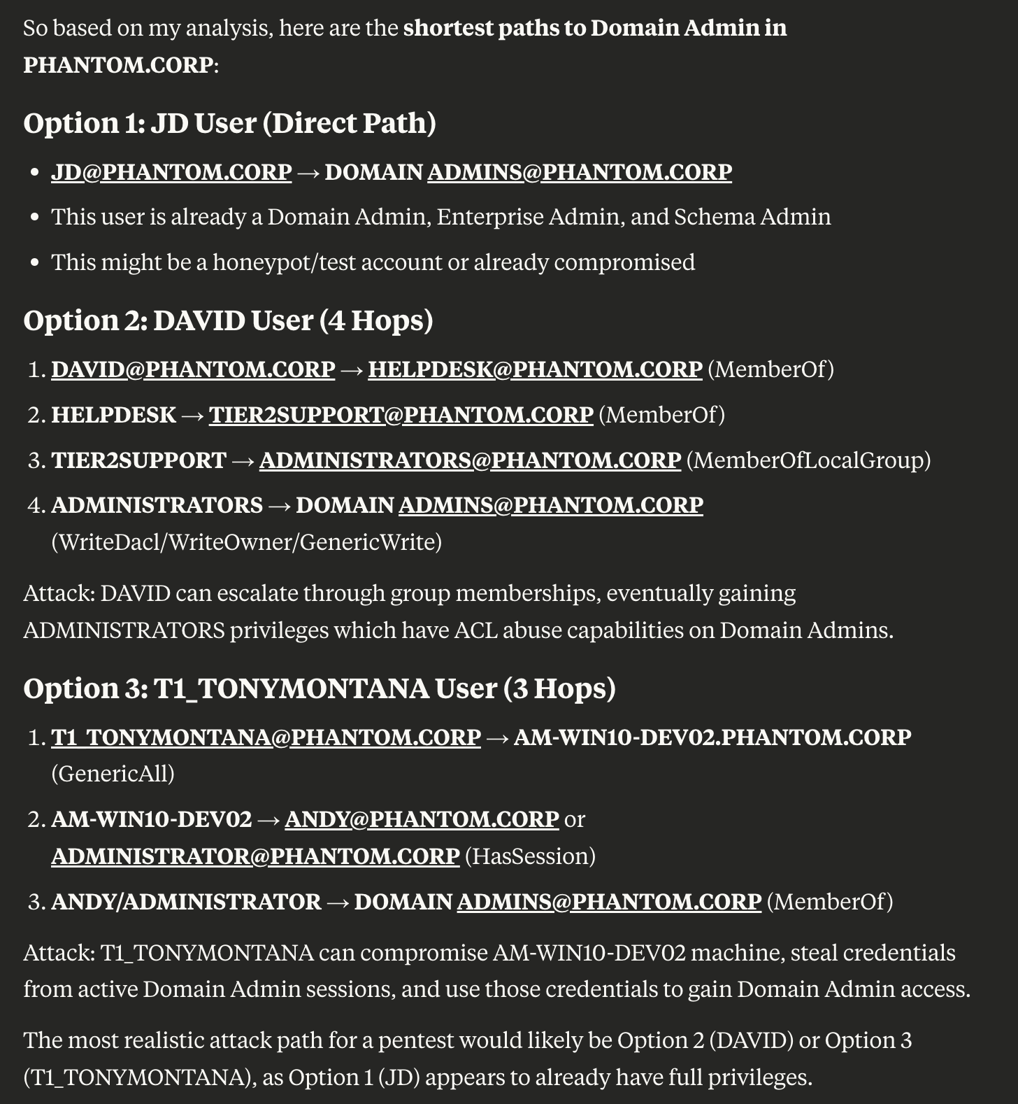 By solving these challenges, the project demonstrates how users with foundational AD knowledge can leverage AI assistants to gain actionable insights into securing (or exploiting) their network.